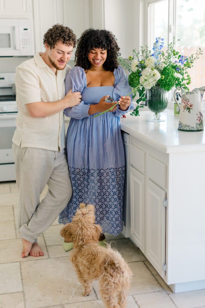 I believe an in-home engagement session really reveals a lot about a couple. What they value and the things that they like. Eli and Maddie’s dogs joined them in the kitchen and on the couch for a few cuddles.